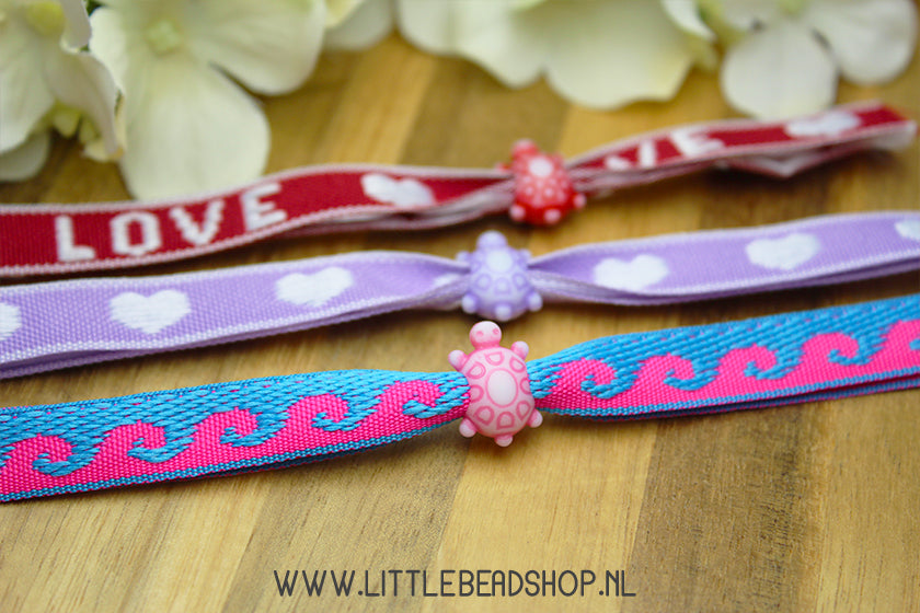 These cute turtle beads are perfect for use as slide beads for ribbon bracelets with text ribbon. The large threading hole allows the ribbon to fit easily through the bead. They're also a great addition to your beaded bracelets! They're available in several colors. Which one do you like best?