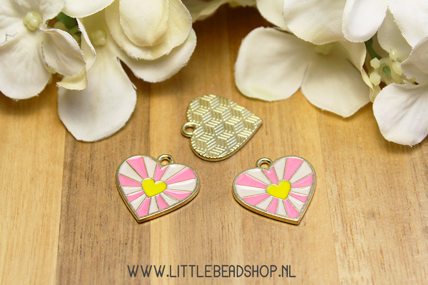 Emaille Bedels Hartje met Strepen Roze/Geel, per stuk