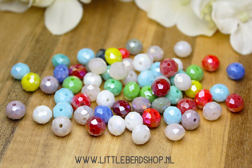 Deze kleine facetgeslepen rondel kralen zijn 8x6mm groot en hebben een rijggat van +/- 1mm. Deze kralen gaan per zakje van +/- 60 stuks willekeurige kleuren kralen.