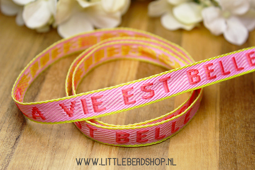 Geweven Lint La Vie Est Belle Roze & Geel, per meter