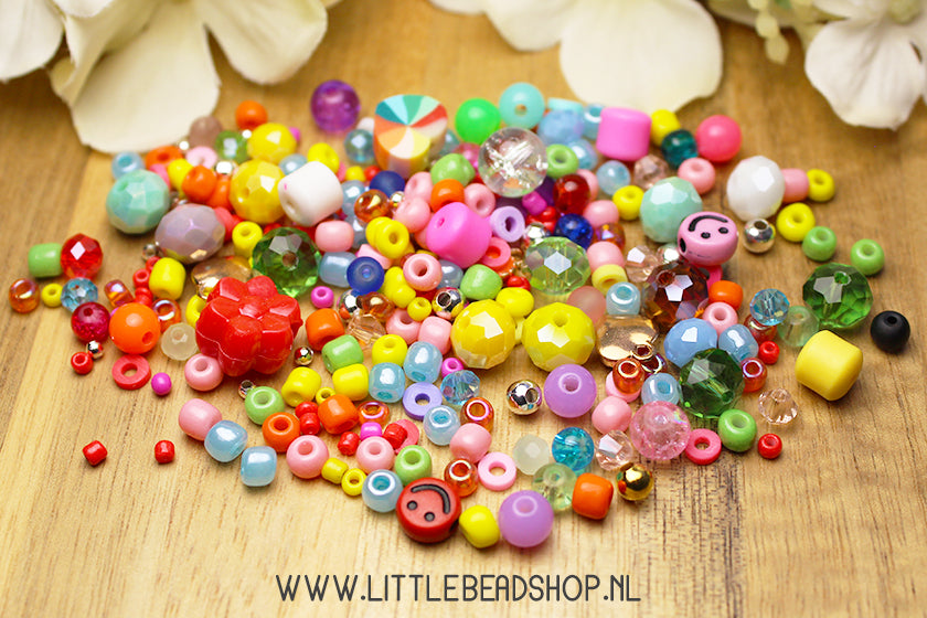 In deze mix zitten heel veel verschillende kralen uit allerlei categorieën. Denk aan rocailles, polymeer en acrylkralen, facet kralen, glaskralen, tussenkralen en zelfs bedeltjes! En iedere mix is weer anders en uniek! De mix wordt verkocht per 30 gram kraaltjes, verpakt in een vrolijk holografisch cadeauzakje.
